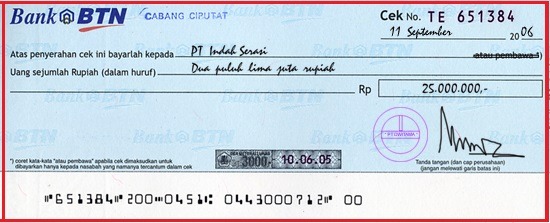 - Tanggal Penerbitan – Ditulis di sisi kanan atas, yaitu 11 September 2006, menandakan kapan cek diterbitkan.